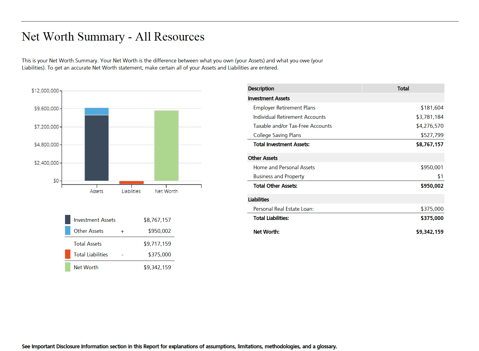 - Net Worth: Assets, liabilities, and overall balance sheet.