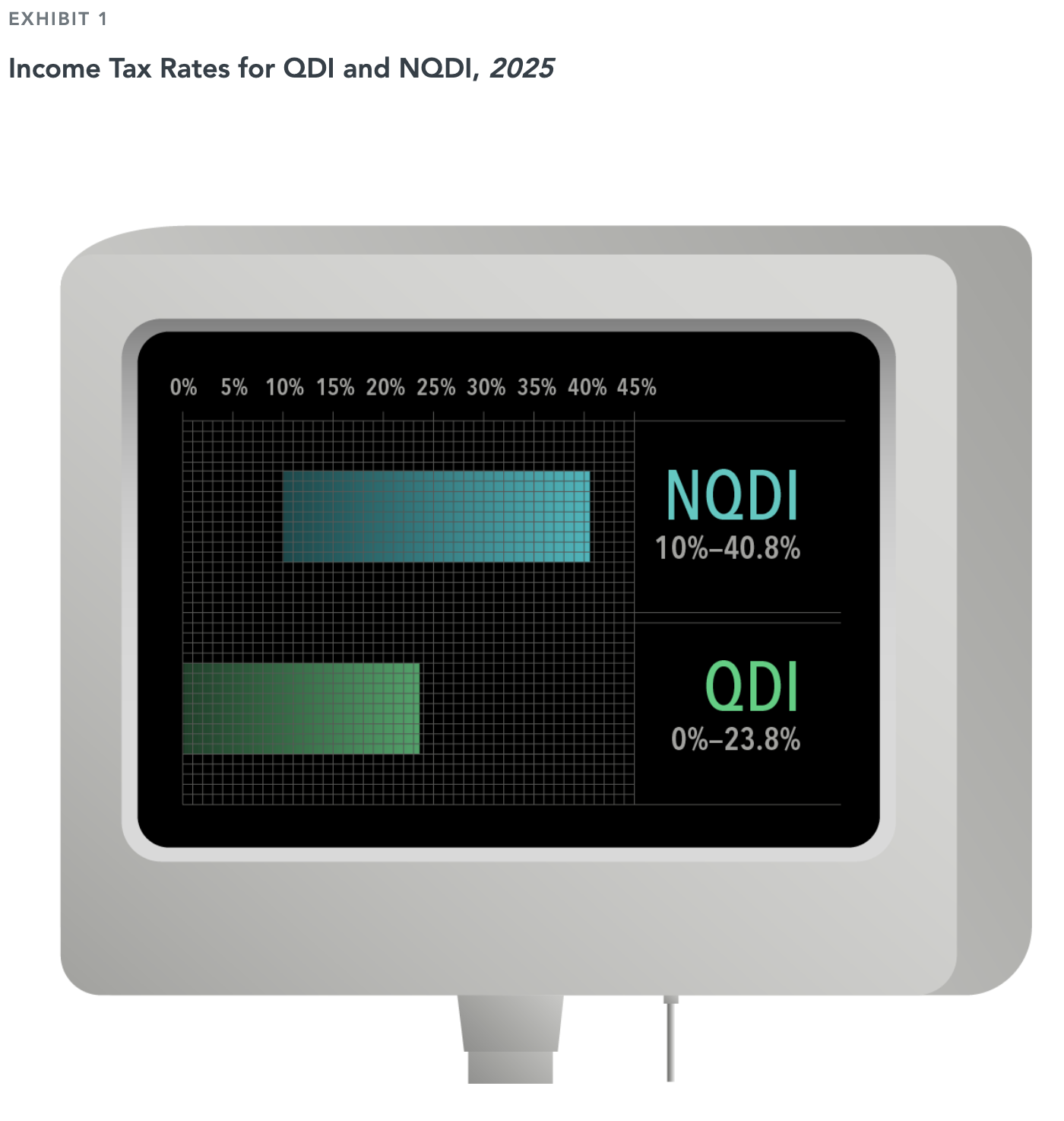 Qualified income, or QDI, is generally taxed at lower rates in the United States than nonqualified income (NQDI). In 2025, the maximum tax rate for NQDI was 40.8%, compared to 23.8% for QDI.1 Like LDL, the “bad kind” of cholesterol, NQDI requires strategies to keep it in check. For a portfolio manager, increasing the percentage of total income that is qualified starts with understanding the sources of income in a portfolio.