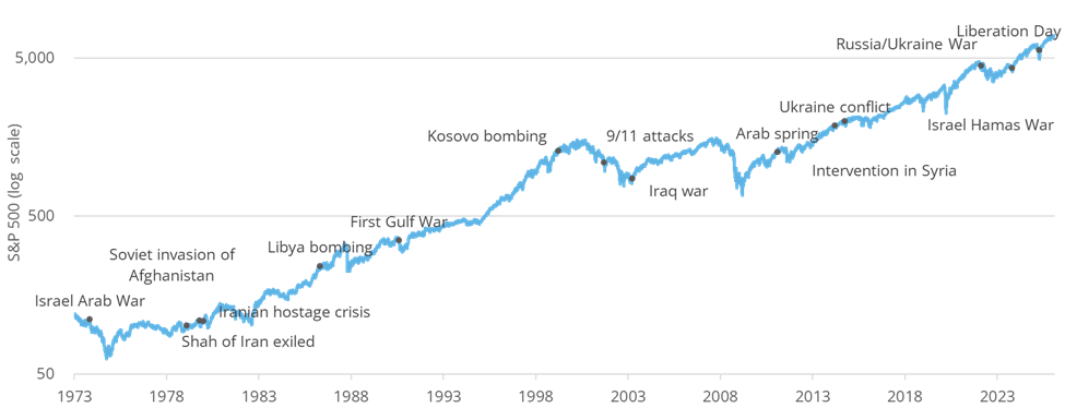 The accompanying chart illustrates the broader point. Over five decades, markets have navigated repeated geopolitical crises. Each produced volatility. None prevented long-term compounding.